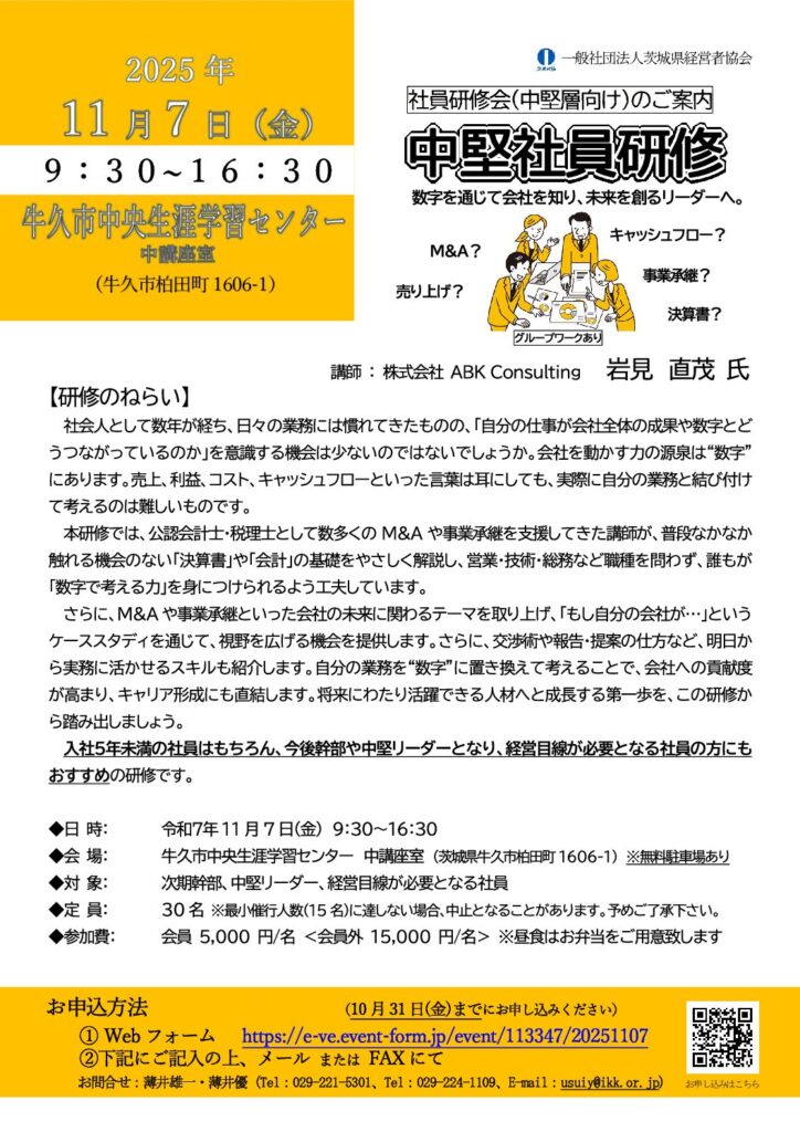 「中堅社員研修 ~数字を通じて会社を知り、未来を創るリーダーへ~」のご案内