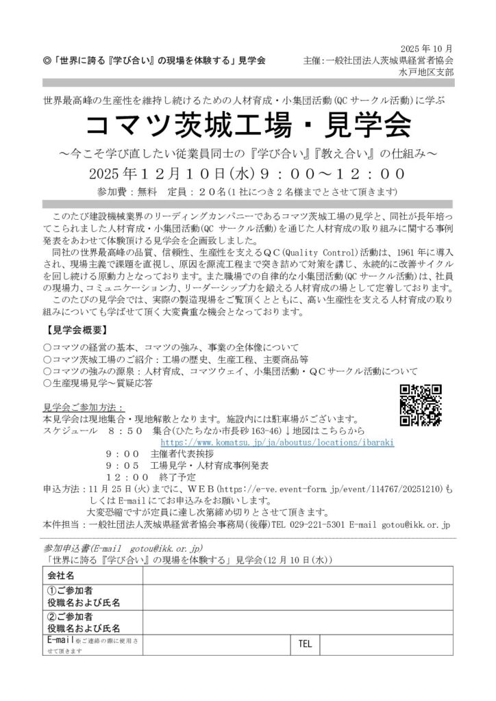 「コマツ茨城工場見学会 ~今こそ学び直したい従業員同士の “学び合い” “教え合い” の仕組み」のご案内
