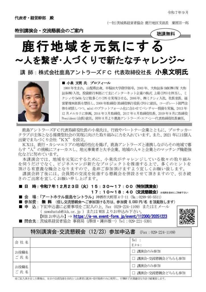 「特別講演会・交流懇親会 鹿行地域を元気にする ~人を繋ぎ・人づくりで新たなチャレンジ」のご案内
