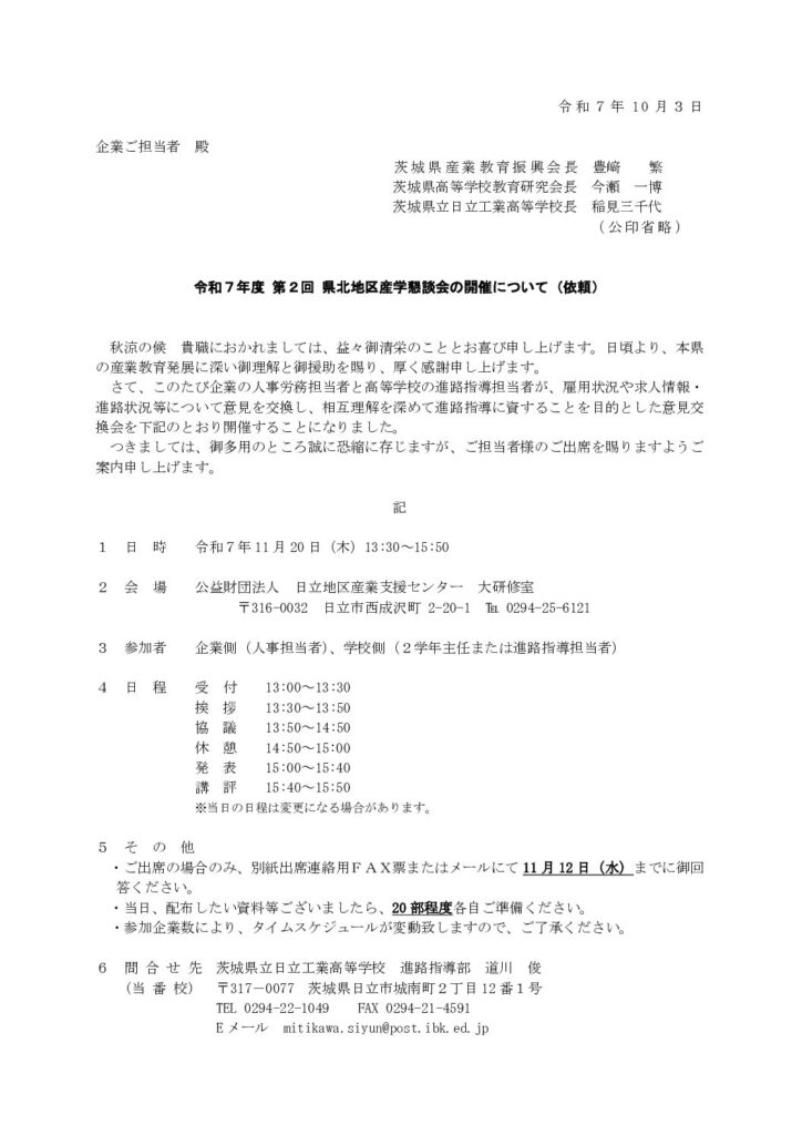 「令和7年度 第2回県北地区産学懇談会」のご案内