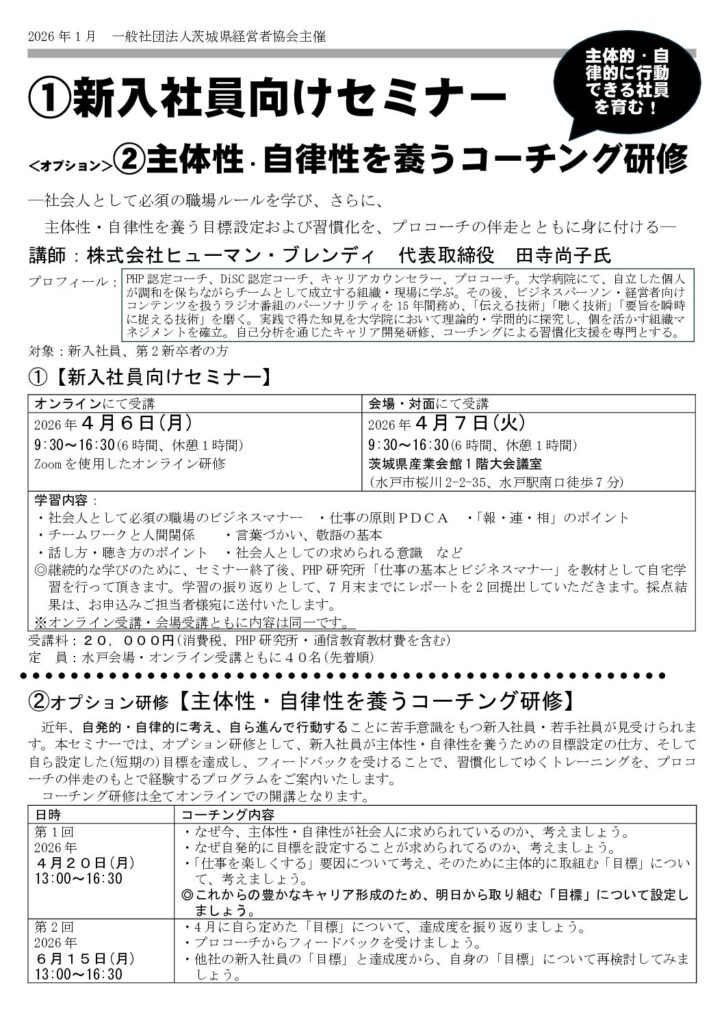 「新入社員向けセミナー 社会人として必須の職場ルールを学ぶ(※PHP通信教育セット) ※オプションで主体性・自律性を養うコーチング研修あり」のご案内