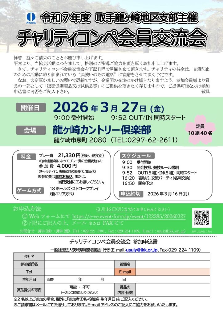 「令和7年度 第8回 会員交流会(チャリティゴルフコンペ 於:龍ヶ崎カントリー倶楽部)」のご案内(2026年3月27日開催)