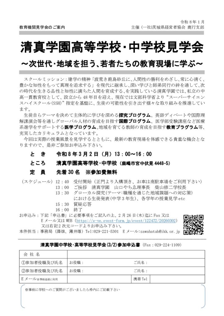 「清真学園高等学校・中学校見学会 ~次世代・地域を担う、若者たちの教育現場に学ぶ~」のご案内