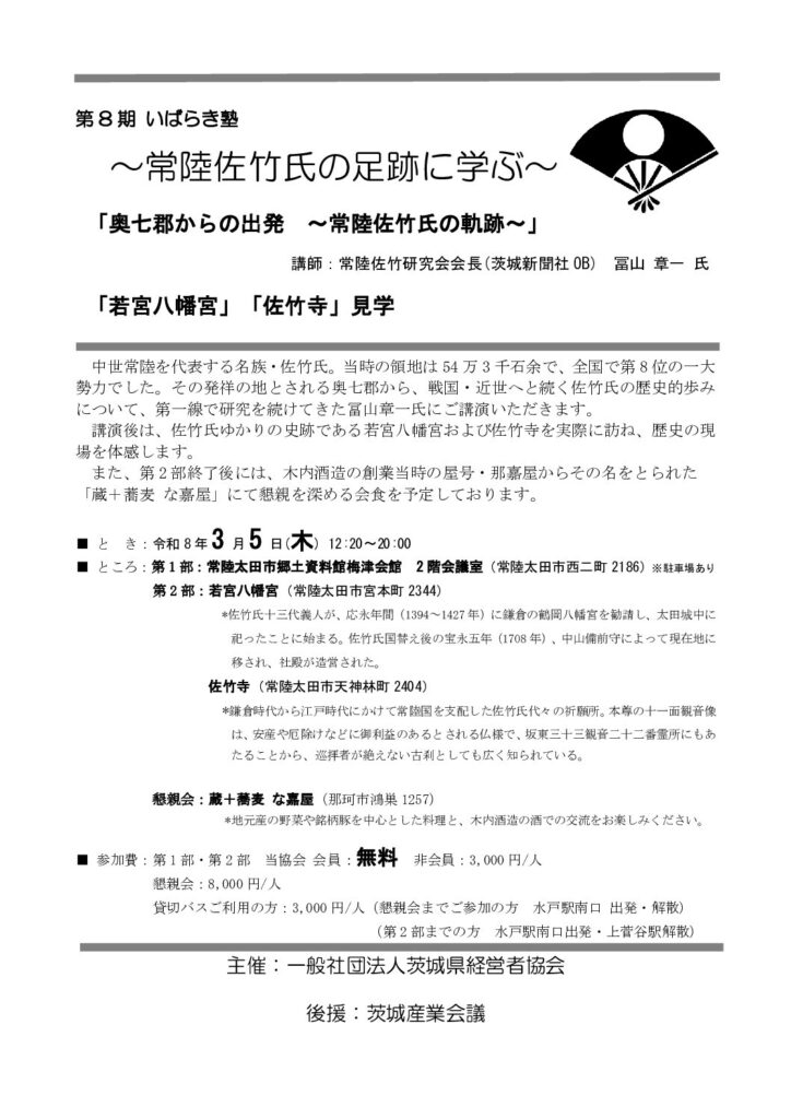 「第8期いばらき塾 ~常陸佐竹氏の足跡に学ぶ “奥七郡からの出発” 常陸佐竹氏の軌跡~」」のご案内