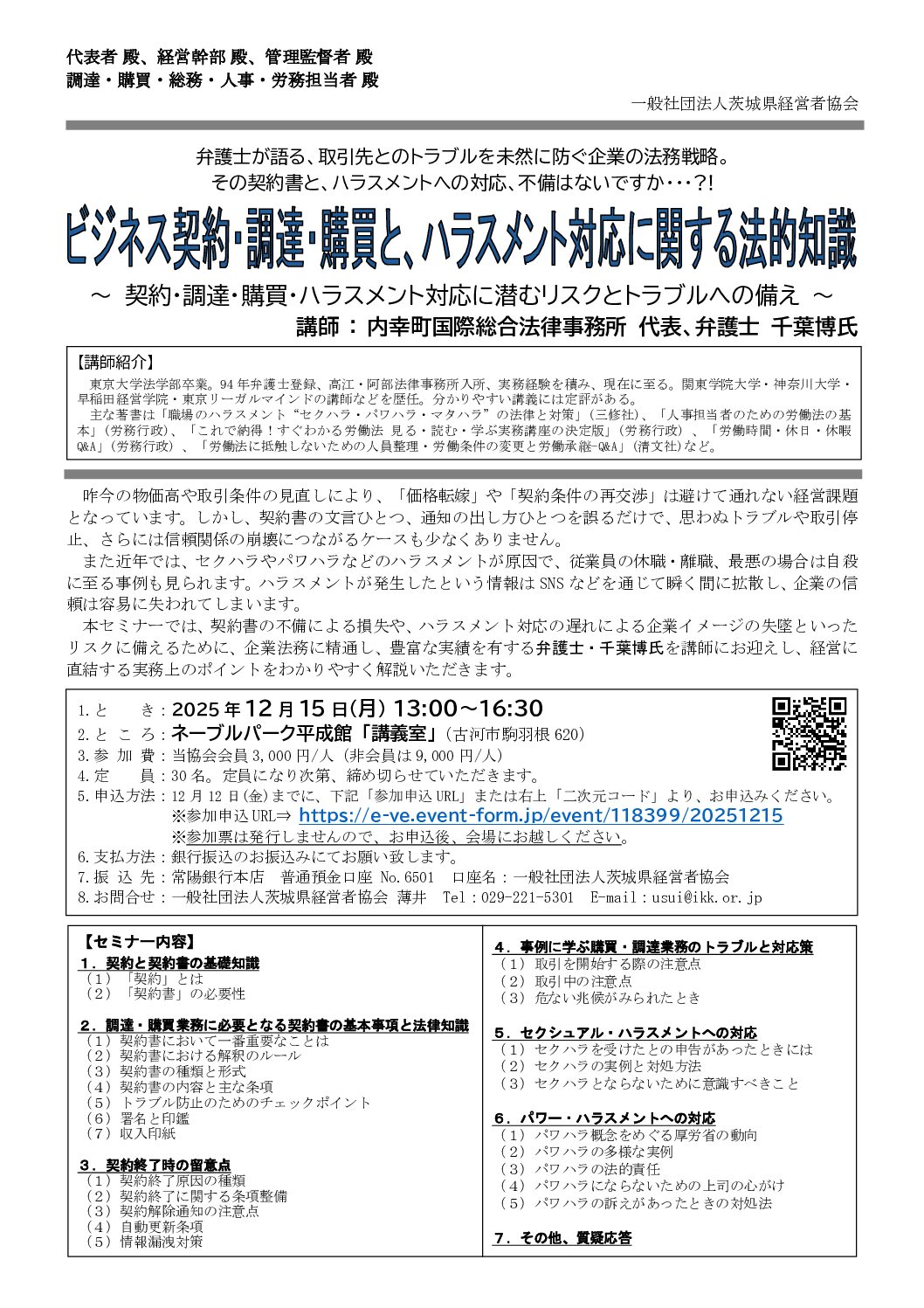 「セミナー ビジネス契約・調達・購買と、ハラスメント対応に関する法的知識」のご案内
