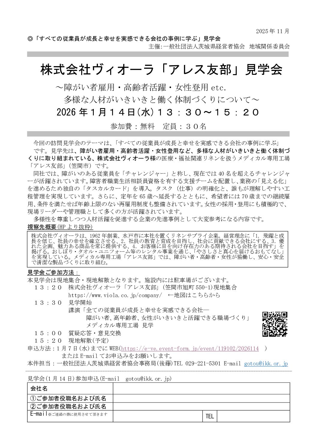 「株式会社ヴィオーラ “アレス友部” 見学会 ~障がい者雇用・高齢者活躍・女性登用等 多様な人材がいきいきと働く体制づくりについて~」のご案内