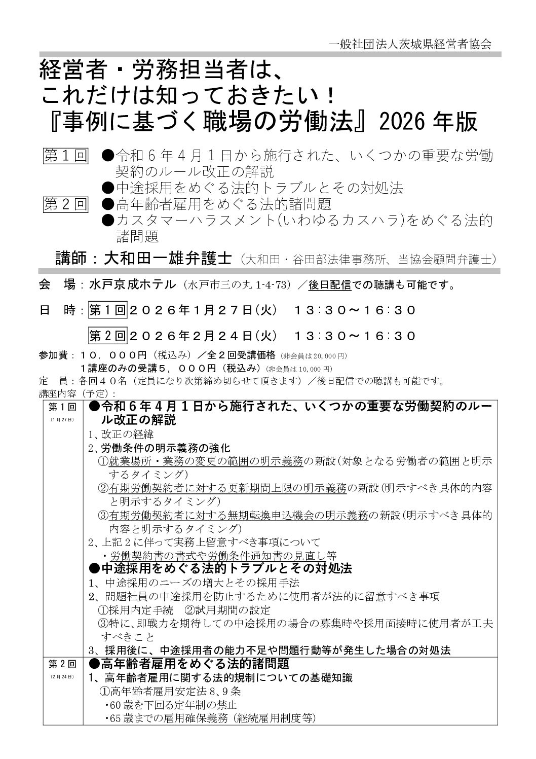 「経営者・労務担当者は、 これだけは知っておきたい!『事例に基づく職場の労働法』2026年版 ※2回シリーズ」のご案内