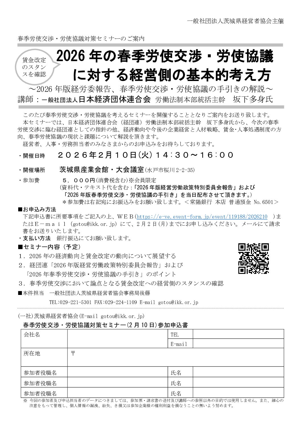 「春季労使交渉・労使協議対策セミナー 2026年の春季労使交渉・労使協議に対する経営側の基本的考え方」のご案内