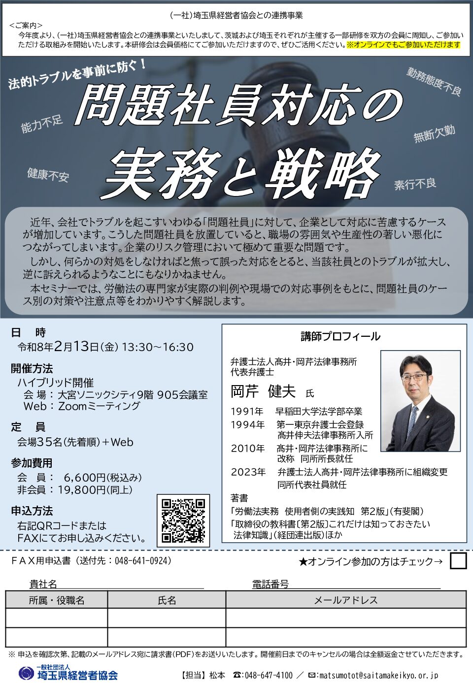 近年、会社でトラブルを起こすいわゆる「問題社員」に対して、企業として対応に苦慮するケースが増加しています。こうした問題社員を放置していると、職場の雰囲気や生産性の著しい悪化につながってしまいます。企業のリスク管理において極めて重要な問題です。しかし、何らかの対処をしなければと焦って誤った対応をとると、当該社員とのトラブルが拡大し、逆に訴えられるようなことにもなりかねません。本セミナーでは、労働法の専門家が実際の判例や現場での対応事例をもとに、問題社員のケース別の対策や注意点等をわかりやすく解説します。 弁護士法人髙井・岡芹法律事務所 代表弁護士 岡芹健夫氏 | 大宮ソニックシティ9階905会議室 又は Web (Zoomミーティング利用) |