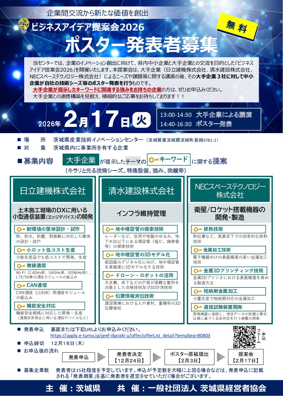 茨城県産業技術イノベーションセンター主催により、企業のイノベーション創出に向け、県内中小企業と大手企業との交流を目的とした「ビジネスアイデア提案会2026」が開催されます。当提案会は、大手企業(日立建機株式会社、清水建設株式会社、NECスペーステクノロジー株式会社)によるニーズや課題等に関する講演後、大手企業3社に対して中小企業が自社の技術シーズ等のポスター発表を行うものです。大手企業が提示したキーワードに関連する強みをお持ちの企業の方は、是非お申込み下さい。大手企業との連携構築を見据え、積極的なご応募をお待ちしております。 ①日立建機株式会社、②清水建設株式会社、③NECスペーステクノロジー株式会社 | 茨城県産業技術イノベーションセンター |