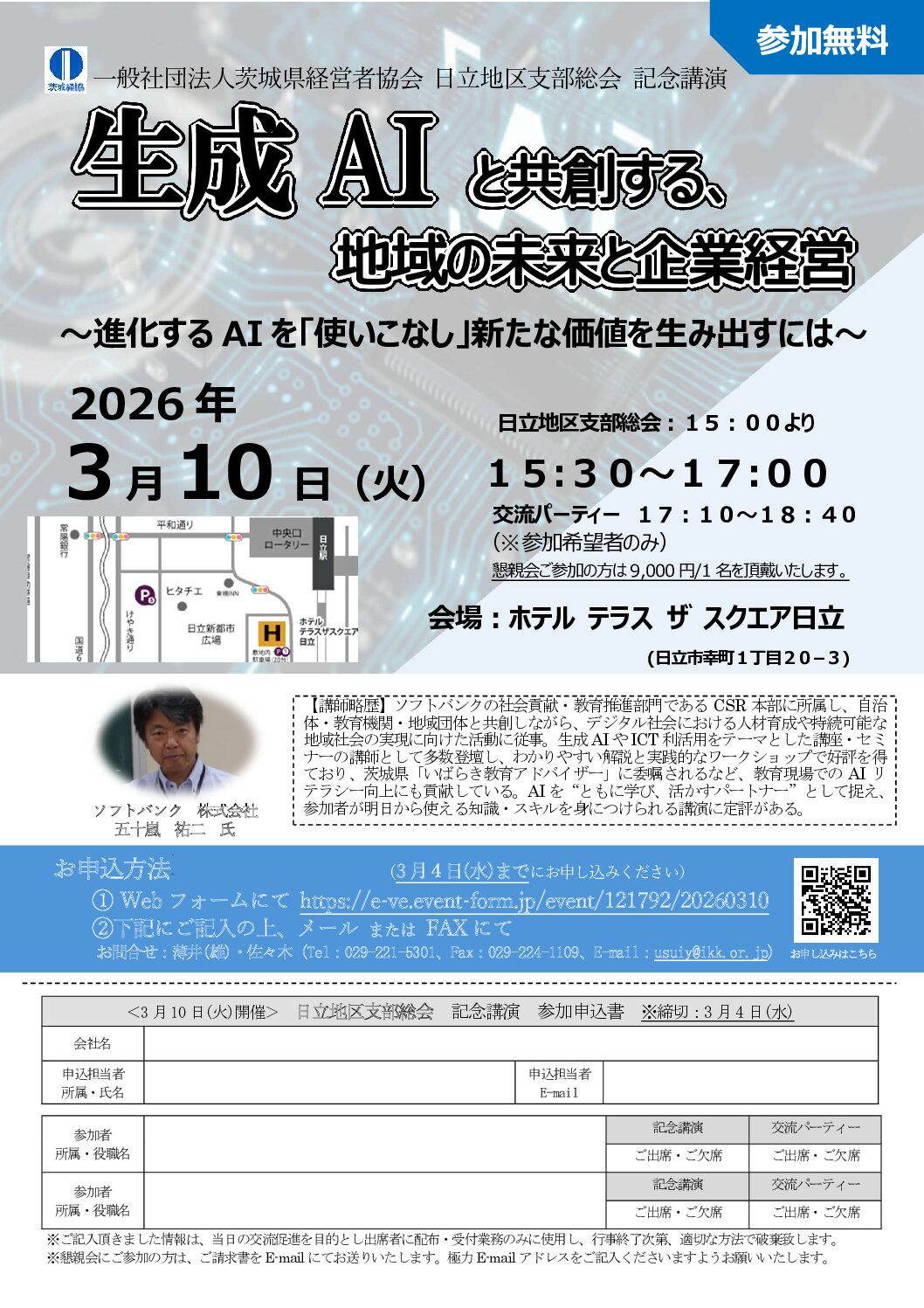五十嵐氏は、ソフトバンクの社会貢献・教育推進部門であるCSR 本部に所属、自治体・教育機関・地域団体と共創しながら、デジタル社会における人材育成や持続可能な地域社会の実現に向けた活動に従事。生成AI やICT 利活用をテーマとした講座・セミナーの講師として多数登壇し、わかりやすい解説と実践的なワークショップが好評。茨城県「いばらき教育アドバイザー」に就任。 ソフトバンク株式会社 五十嵐祐二氏 | ホテル テラス ザ スクエア日立 |
